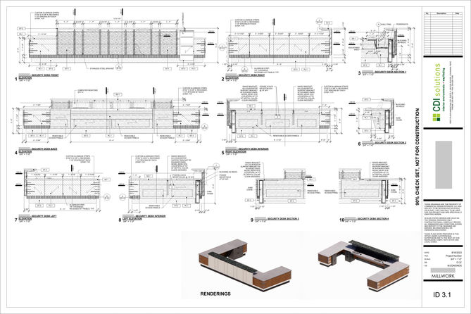 An overview of collaborative design work with CDI Solutions, encompassing project management, coordination and communication with multidisciplinary teams, construction documentation, renderings, and millwork details. Experience spans financial institutions, governmental buildings, franchises, etc.